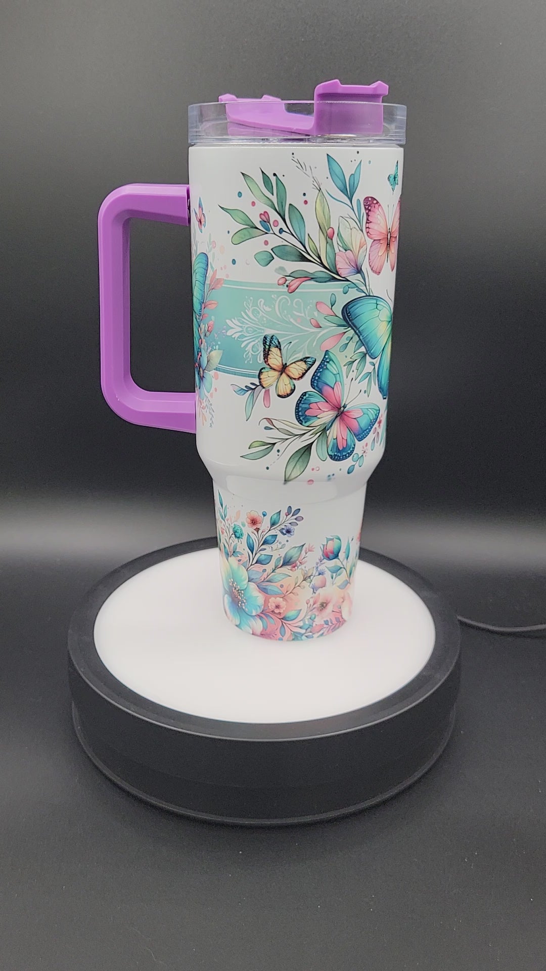 Each tumbler features a colored handle and matching lid topper. Available handle colors include white, black, pink, purple, and teal. Choose the color that best complements your style.