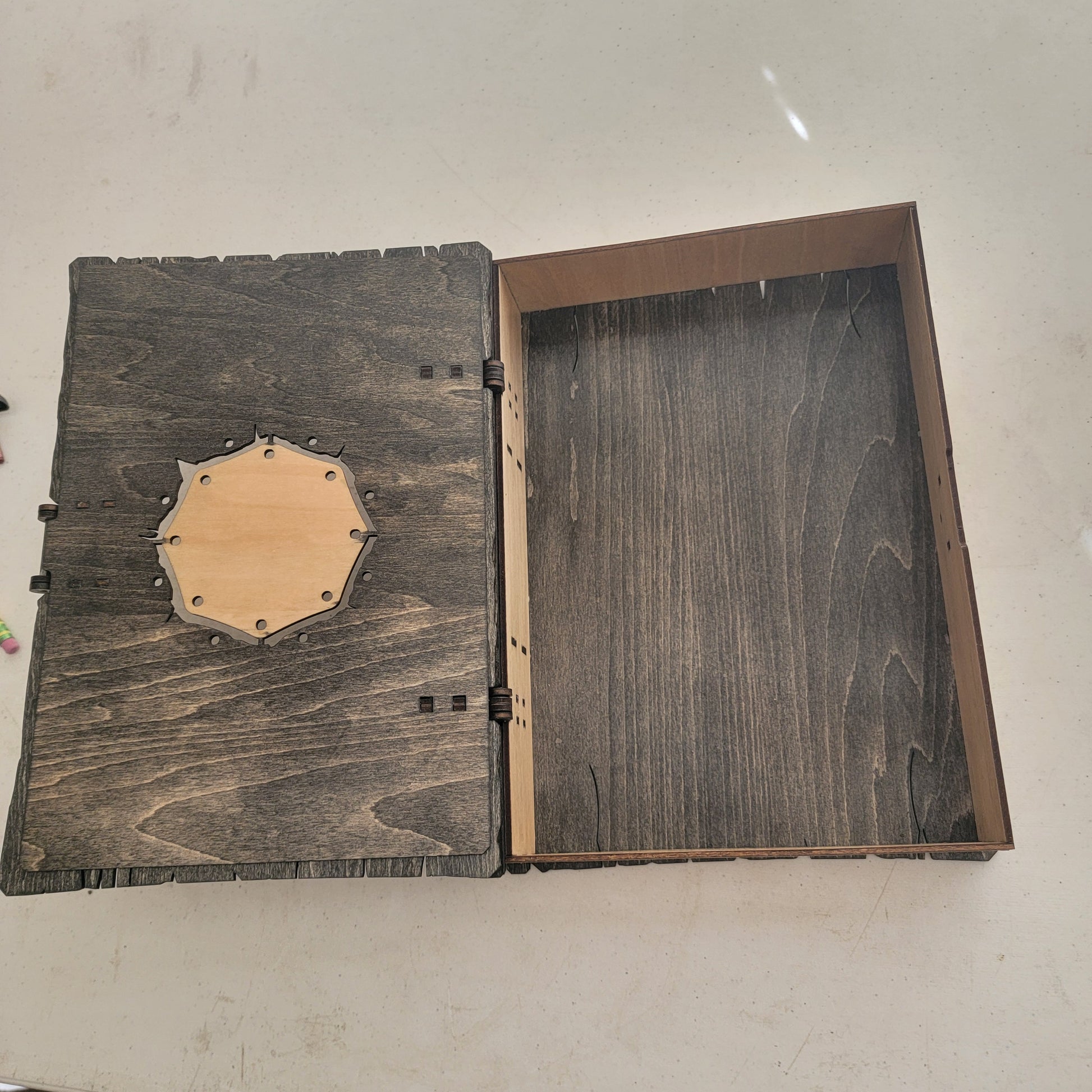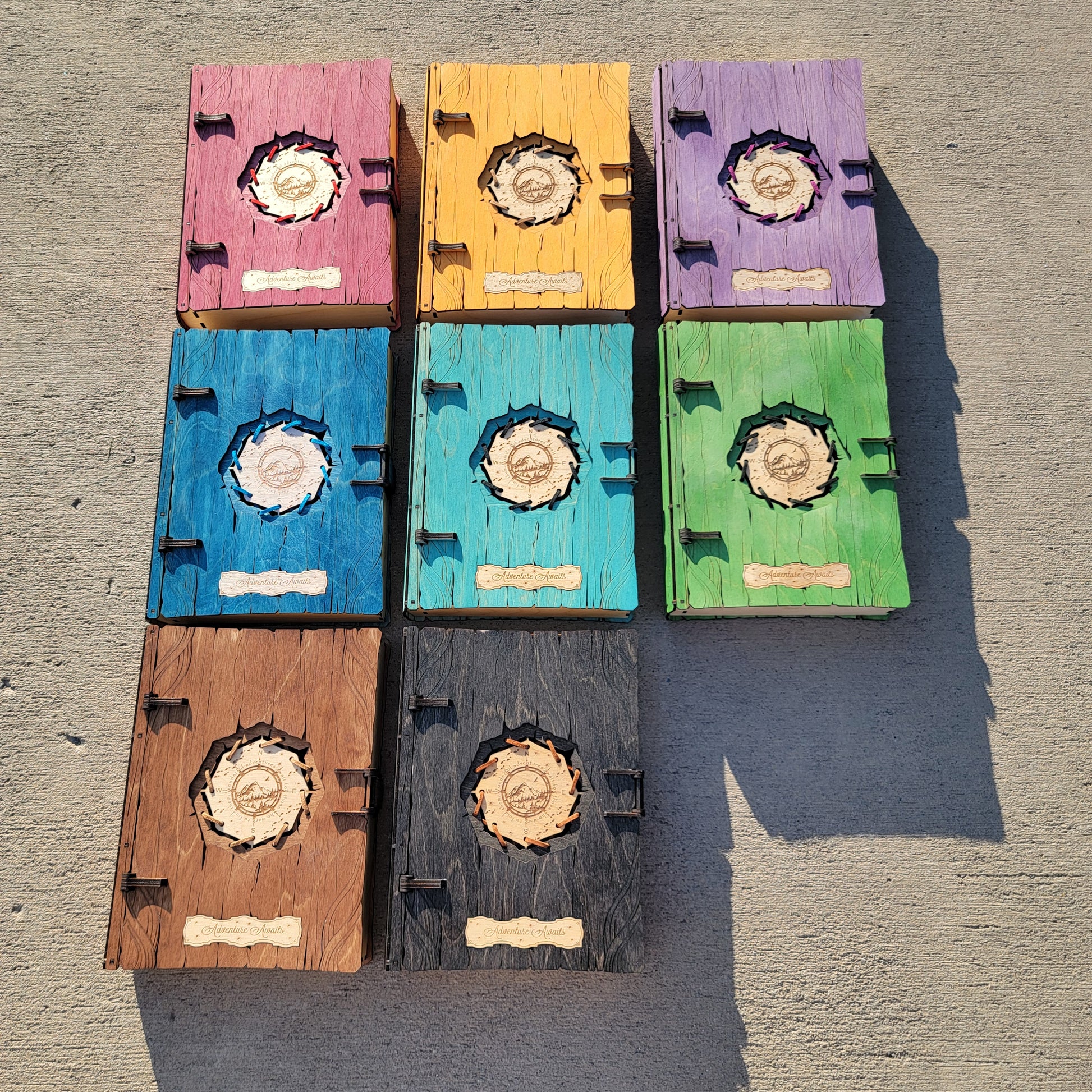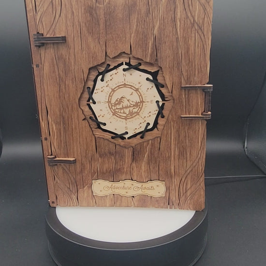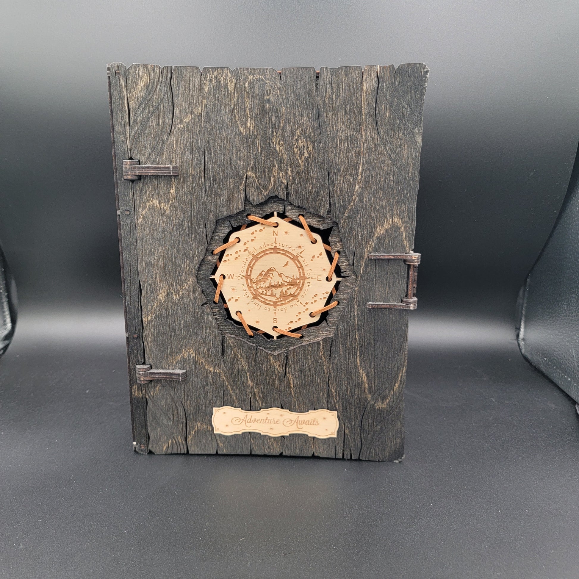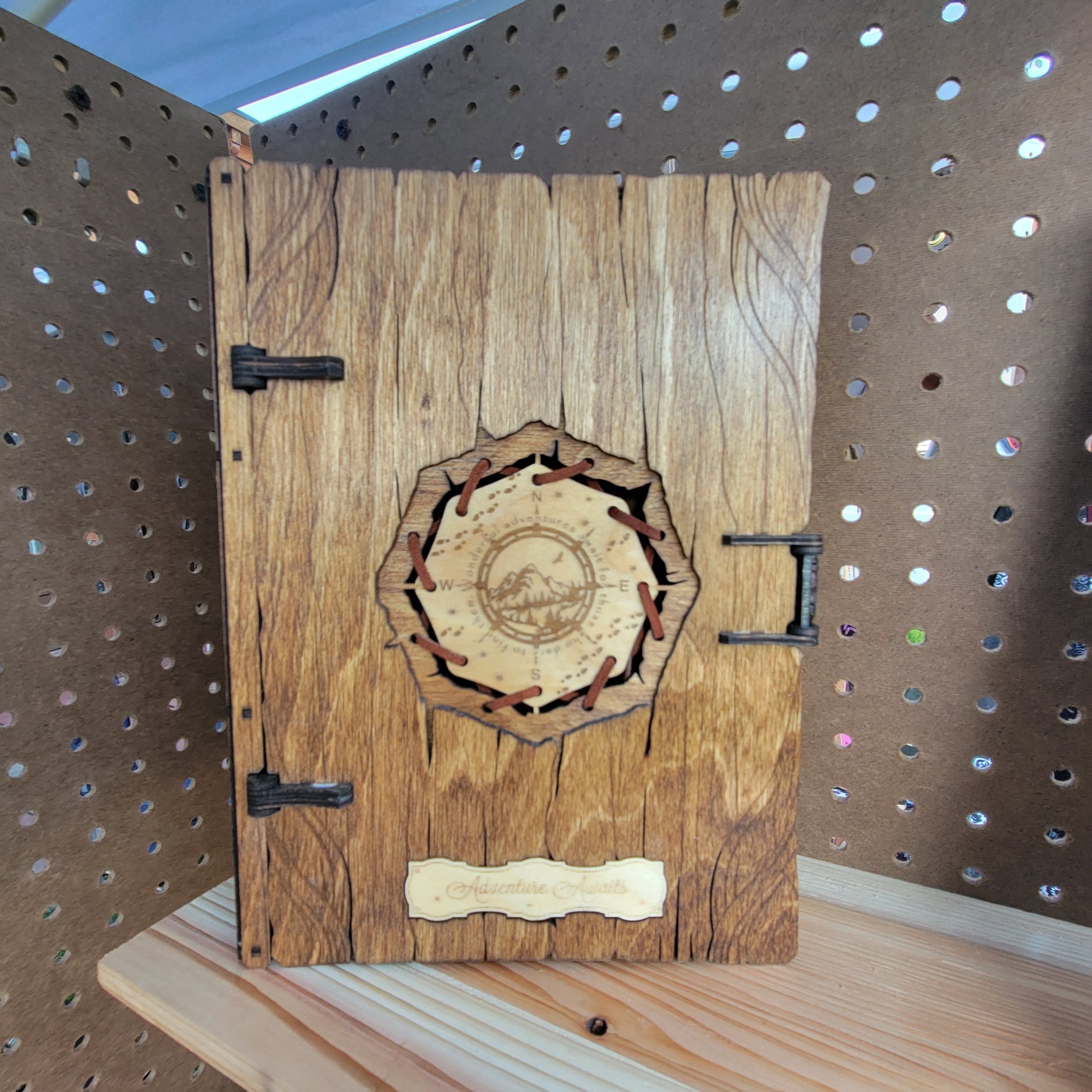 This beautifully handcrafted trinket box is laser-cut from high-quality 3mm ply-wood and features a wood stain of your choosing with a smooth, polished finish. The box is adorned with a stunning engraving of a compass rose, a mountain scene, and footprints, perfectly complementing the inspiring phrase 'Adventure Awaits.' A leather lace accent adds a rustic touch (lace colors will vary), making it a charming keepsake for adventurers and dreamers alike. Ideal for storing small treasures, jewelry, or mementos, this box is both functional and decorative—a perfect gift for those who cherish exploration and nature.