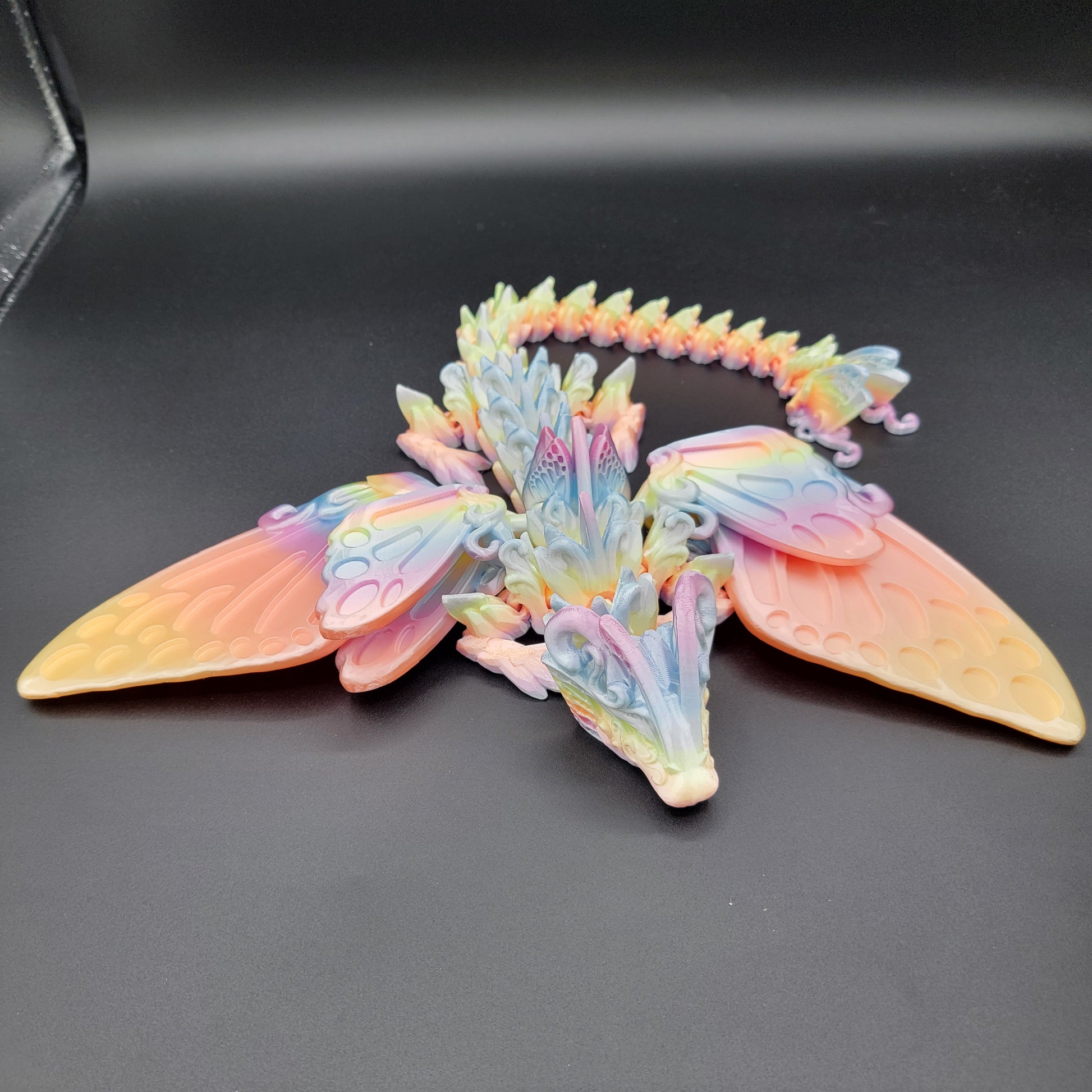 This Butterfly Winged Dragon showcases solid butterfly wings with a dramatic 16-inch wingspan. The multicolor silk filament gives the wings a vibrant, glossy appearance that makes every dragon unique.