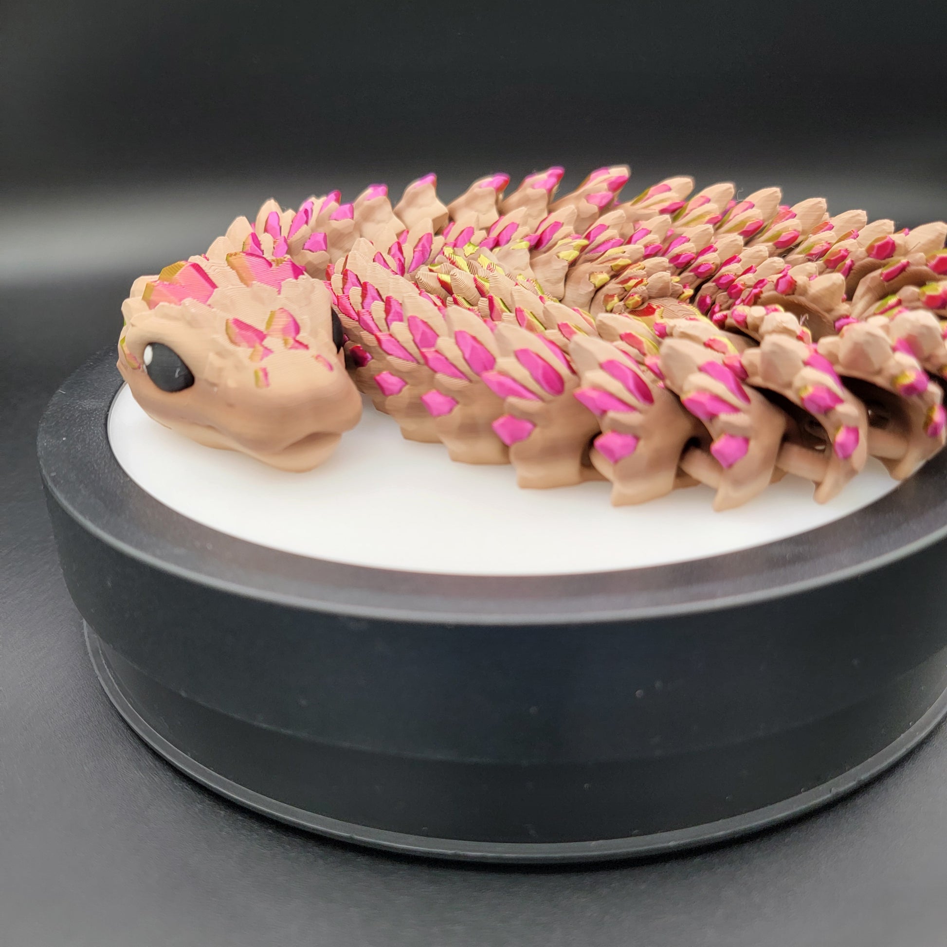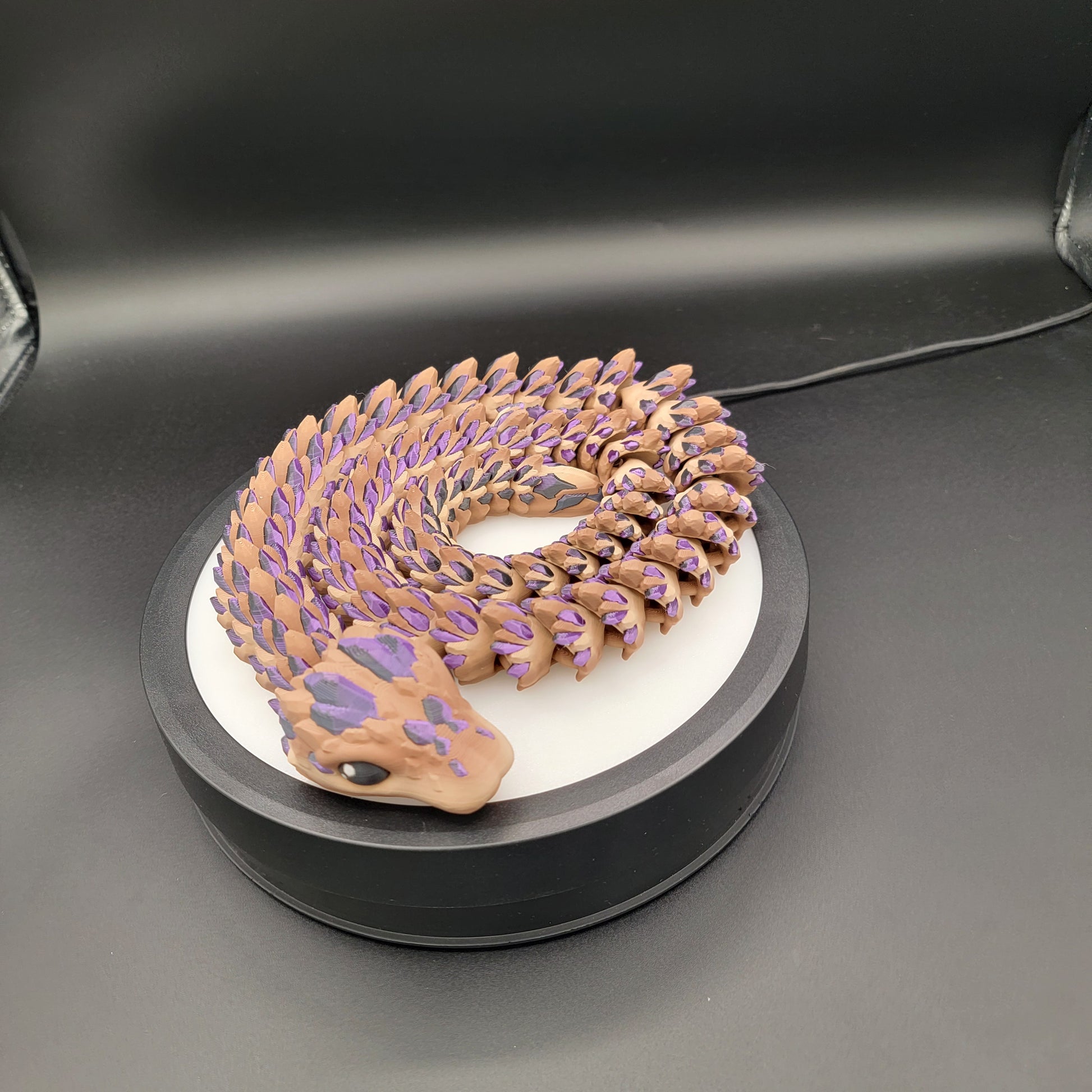 Because of the multicolor filament and printing process, each snake has its own unique pattern and color flow. We do not keep specific colors in stock, but we’re happy to send photos of what is currently available or create one using colors of your choice.