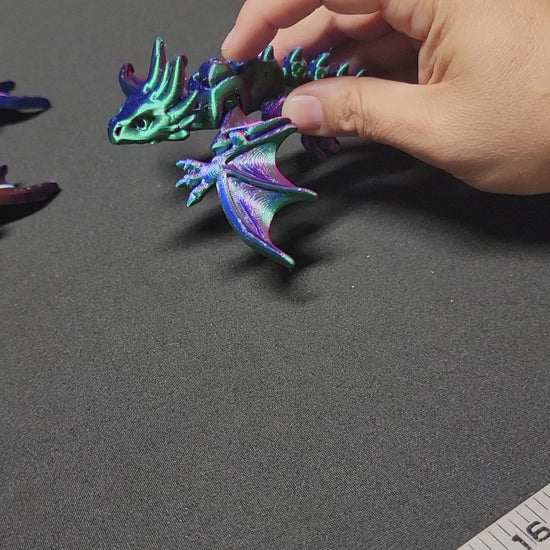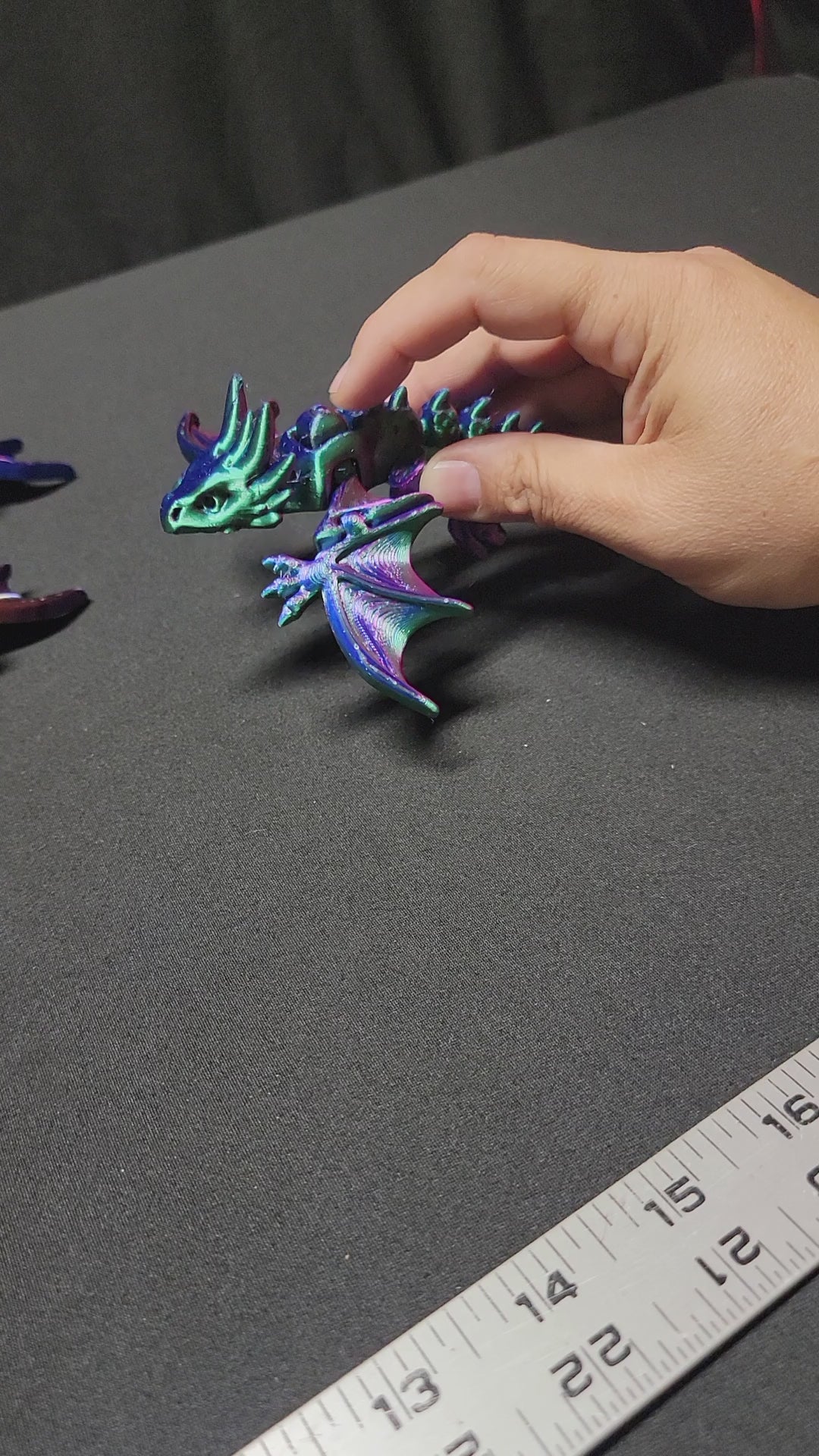 This flexi is an adult version of the Little Flying Dragon. Its horns and spikes are more pronounced. The button on its back is the secret fully enjoy playing with this Dragon. Pressing it will cause its mouth to open and its wing to flap.