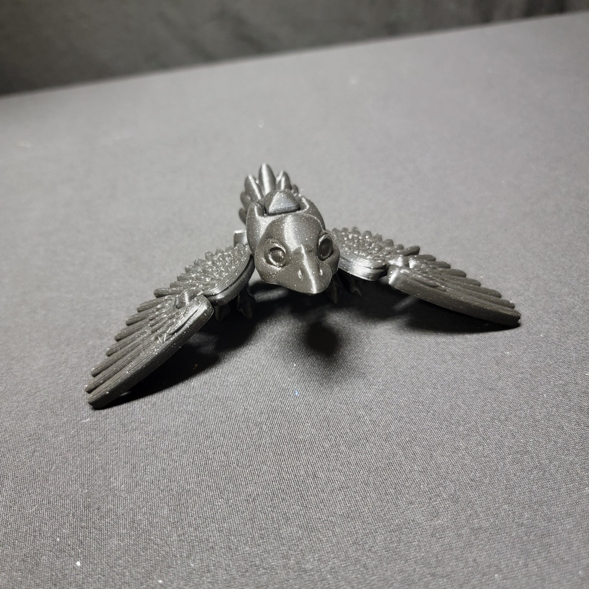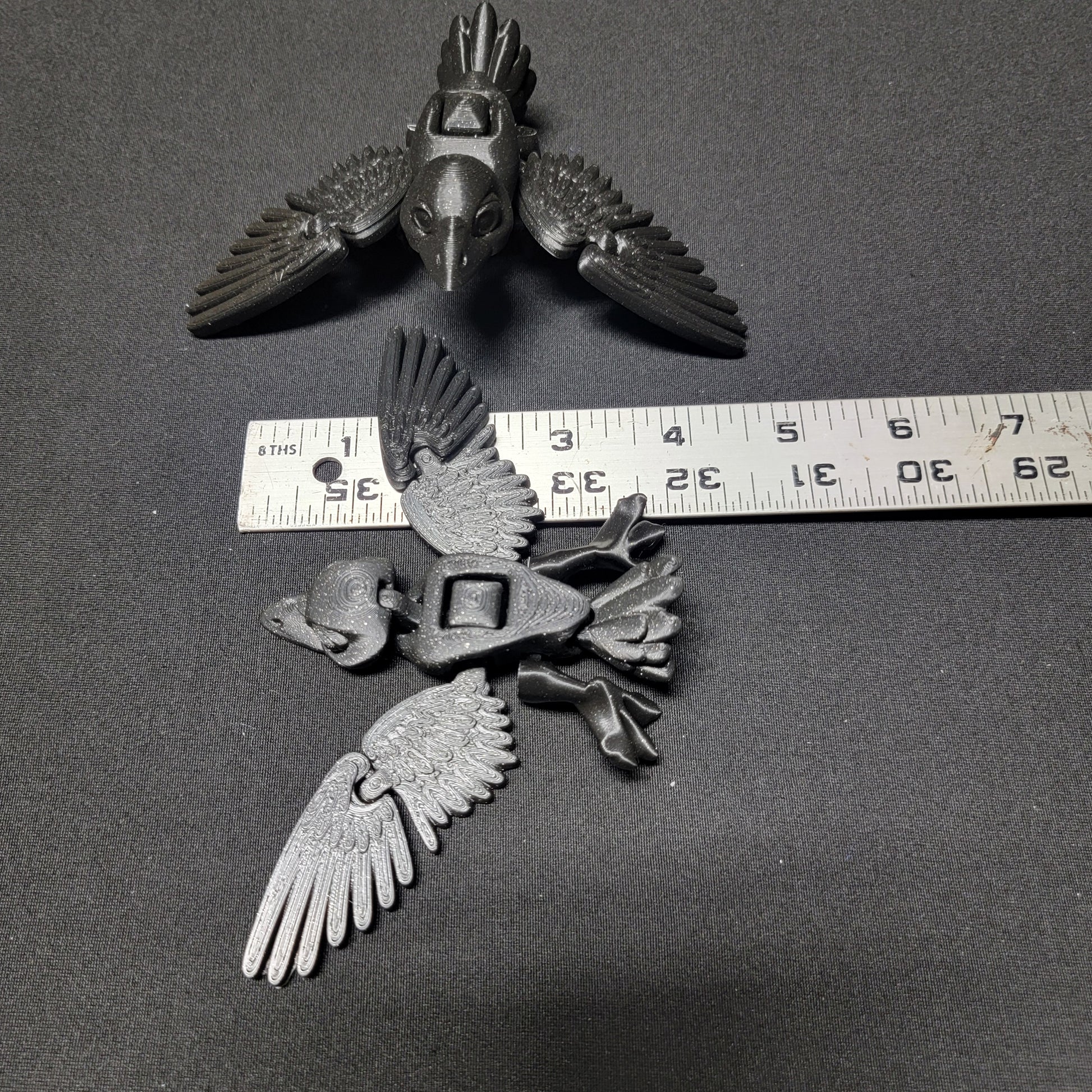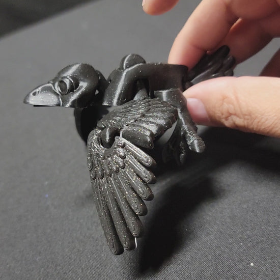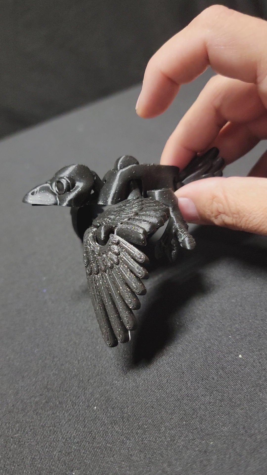 This flexi animal is inspired by a messenger crow. Pressing the button on its back will move its wings and open its mouth for you. This crow will also stand on its feet.