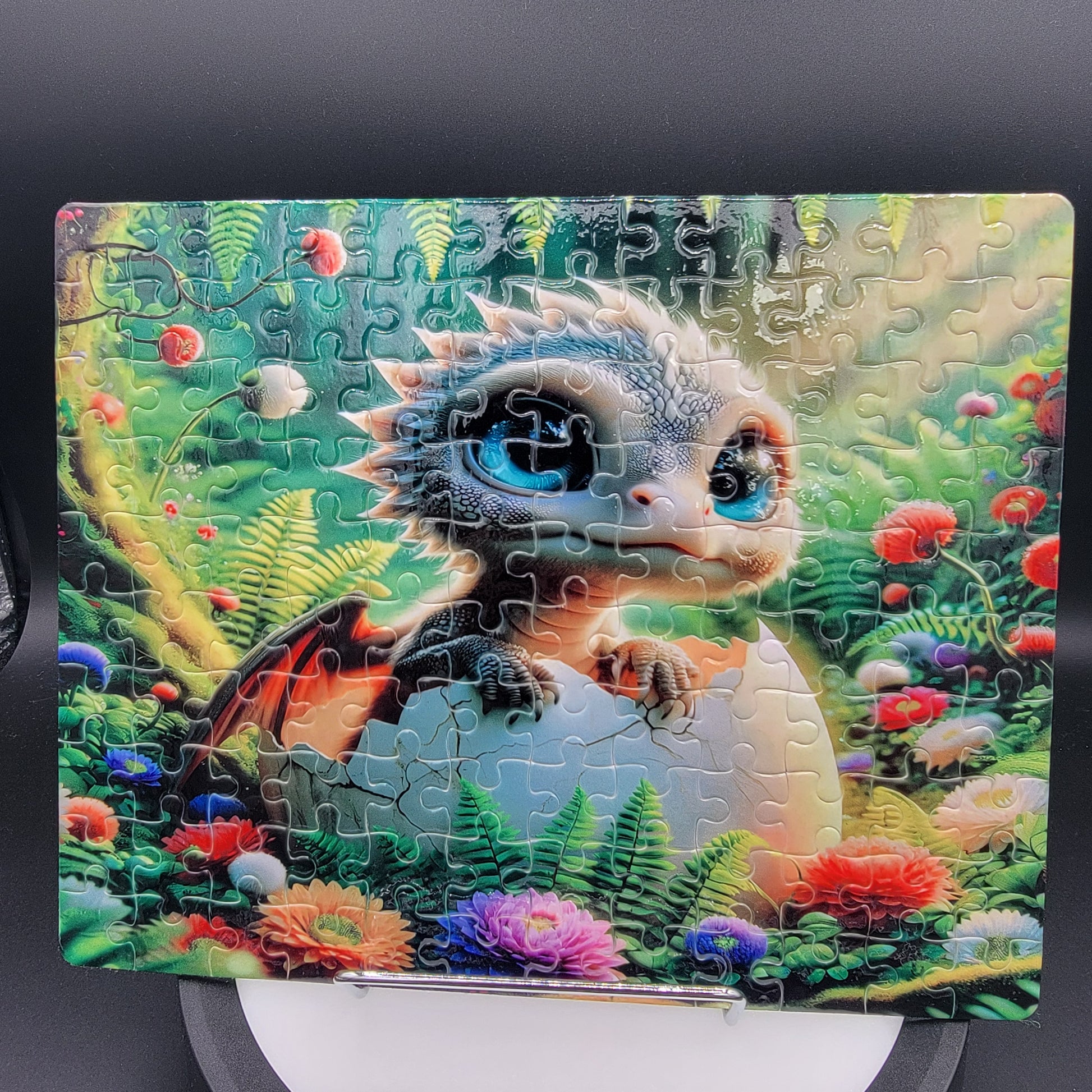 Celebrate new beginnings with this enchanting 120-piece sublimated puzzle featuring a baby dragon hatching from its egg. Set in a moss-covered forest on a bright spring day, the scene is filled with fresh flowers, soft sunshine, and the gentle magic of new life.