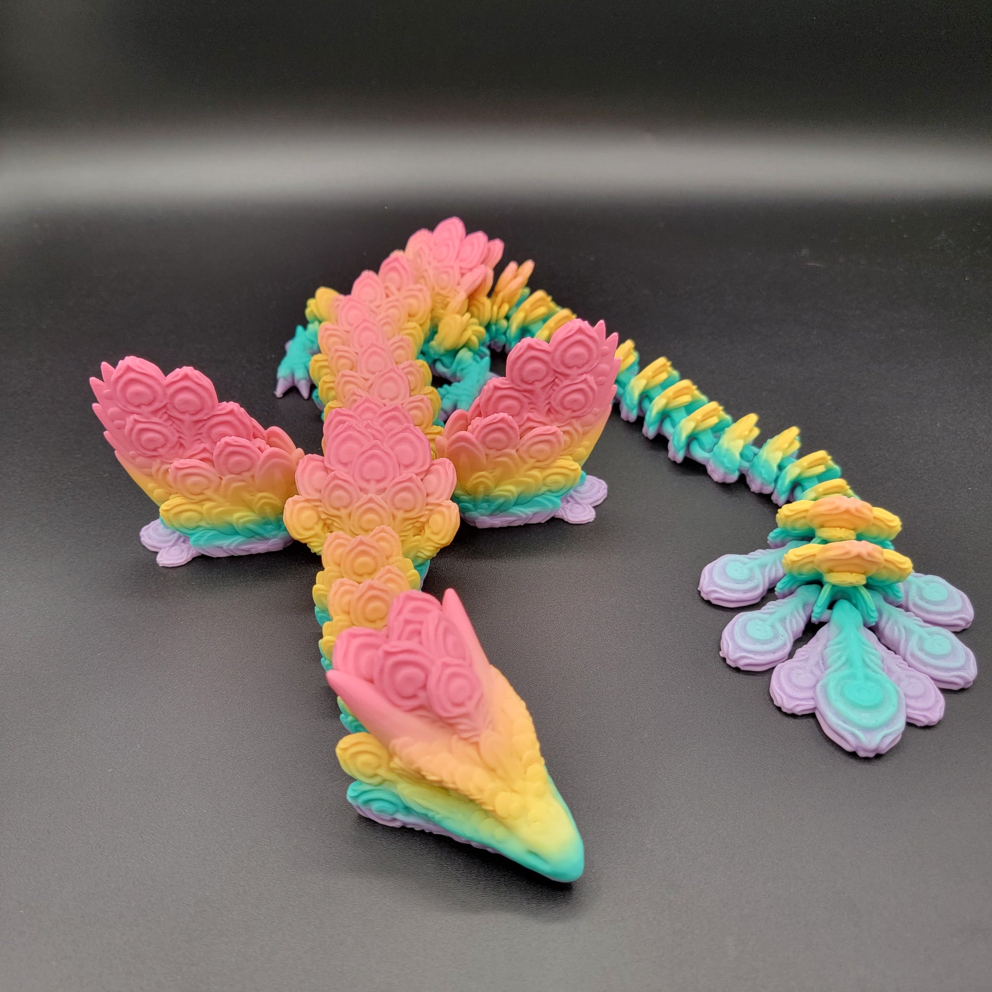 This stunning Peacock Dragon is a fully articulated 3D print adorned with elegant peacock feather details along its body and wings. Printed in multicolor silk filament, the glossy finish creates a flowing blend of colors that makes each dragon completely unique.
