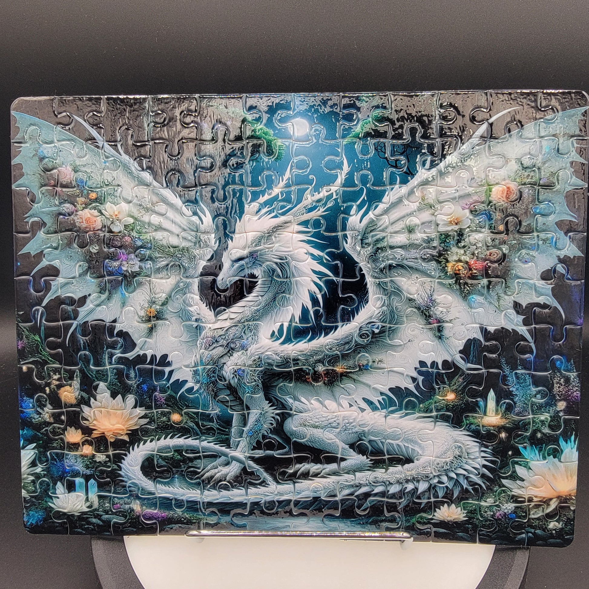 This captivating 120-piece puzzle features a majestic white dragon set within a mysterious wonderland forest. The detailed fantasy artwork shines with vibrant sublimated color and depth.